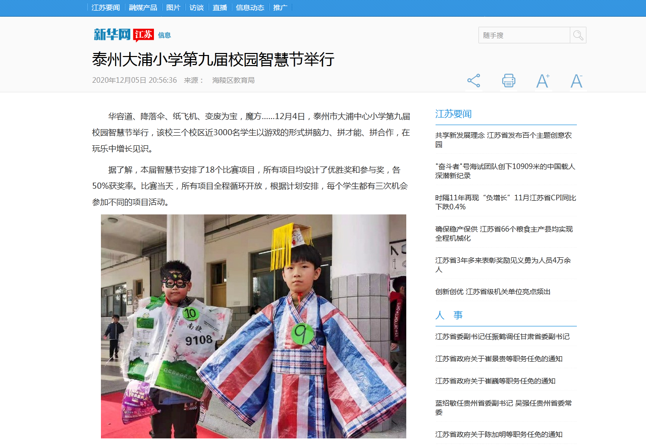 《新华网》泰州大浦小学第九届校园智慧节举行