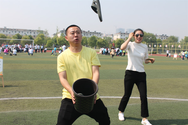 运动会共开设了“两人三足““赶鸭子过河”“甩拖鞋”“抢椅子”等18个游戏运动项目。最有趣的是“甩拖鞋”运动了,孩子们穿着大人的拖鞋,用脚使劲儿把拖鞋朝着前方的爸爸甩过去。爸爸们则拎着塑料桶接拖鞋,桶里拖鞋多者获胜。