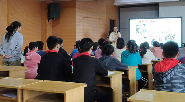城东中心小学王静雯和王旭峰两老师分别向与会老师们展示了《公民的基本权利》《守法不违法》两节研究课。王静文老师的课以超市保安搜身的视频导入,引发学生的思考,在启发式教学原则的指导下,采用学生喜闻乐见的情境表演、模拟法庭、视频辨析等形式,让学生在活动中感知我国宪法赋予给公民的具体权利,在理性思辨中认识到公民权利的行使有边界,明白不滥用权利的道理。