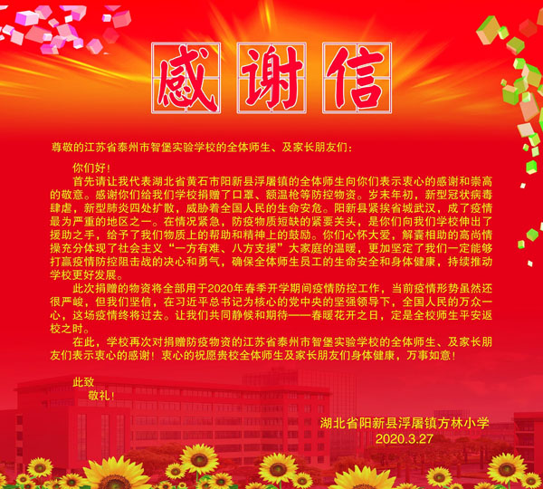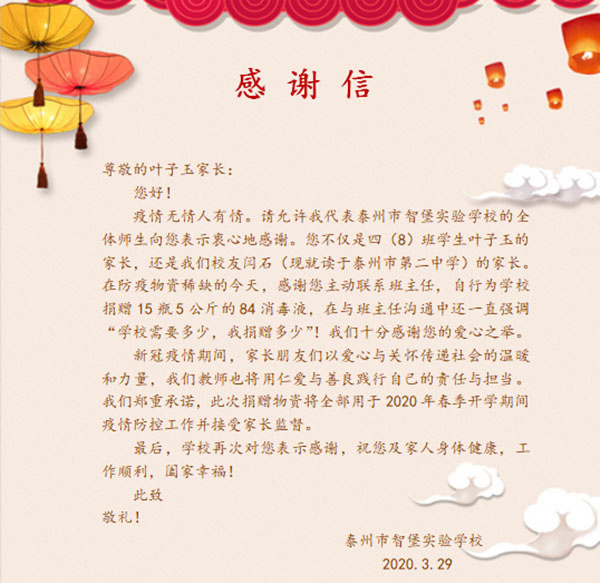 两封感谢信 来源:智堡实验学校 作者:徐小思 发布时间:2020-03-31 浏览次数: 次 【字体:小 大】 3月29日,泰州市智堡实验学校四(8)班叶子玉同学的家长向学校捐赠了75公斤84消毒液,助力学校防控疫情。班主任孙亚平老师写了感谢信,表达对家长的谢意。 就在两天前,智堡实验学校也收到来自湖北省阳新县浮屠镇方林小学的一封“感谢信”。原来智堡实验学校向该校捐赠口罩、额温枪等防疫物资。据了解,在3月11日,智堡实验学校响应省少工委的号召,在湖北黄石市少工委的牵线下,与方林小学结对成友好学校,帮助方林小学渡过防疫难关。 分享到: 【打印正文】 相关内容