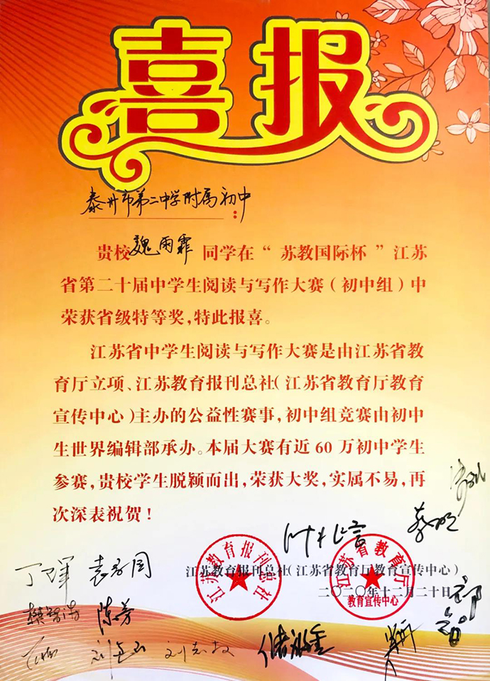 “苏教国际”杯江苏省第二十届中学生阅读与写作大赛(初中组)决赛成绩12月20日揭晓,海陵区6名选手参加省决赛并获奖。泰州二附中魏雨霏同学夺得特等奖第二名。