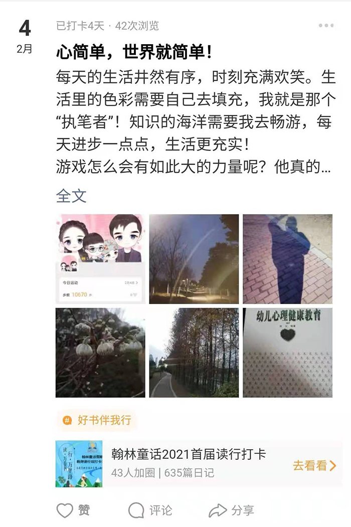 “读书+运动”双打卡,翰林童话幼儿园教师假期生活很有“料” 来源:翰林童话幼儿园 作者:周升平 发布时间:2021-02-14 浏览次数: 次 【字体:小 大】 你的积分多少了?” “今天读书、运动打卡了么?” “亲们,一起组团跑步去!” 寒假期间,这些话已成为海陵区翰林童话幼儿园教师线上见面的问候语。2月1日,该园开展了为期一个月的教师寒假读书、运动双打卡活动。老师们每天坚持线上打卡,不断提升思想境界、文化素养、业务能力和身体素质,为来年工作积蓄能量。 分享到: 【打印正文】 相关内容