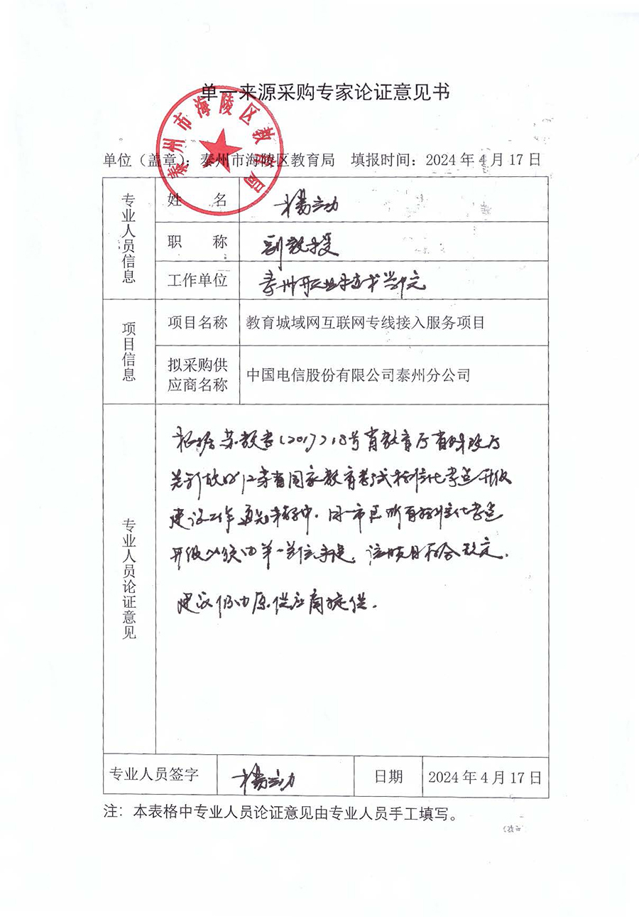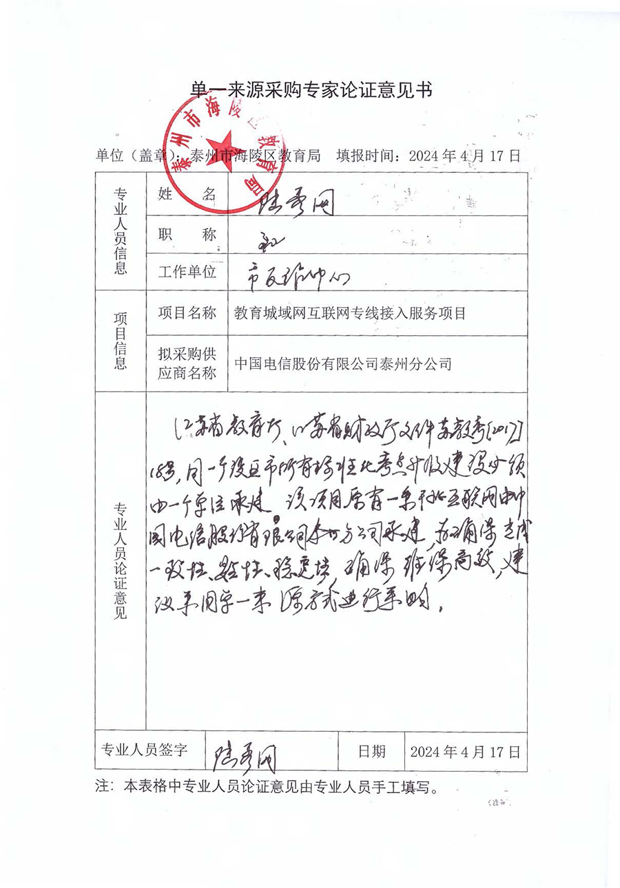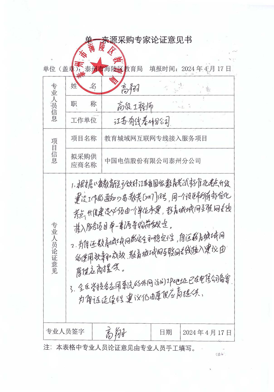 海陵区教育城域网互联网专线接入服务项目单一来源采购公示
