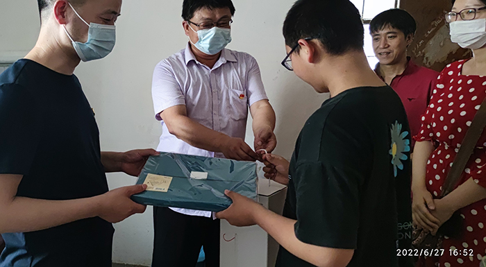 6月27日下午,烈日炎炎,泰州市海军中学党支部书记陈澍、副校长孙步云以及教师妈妈代表等一行4人走进学生家中,为家庭送去慰问,为学生送去学习用品。