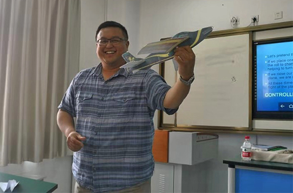回到教室后,学员们以为这节课不过是“看图--折叠---飞行”的动手制作而已。这时,Alan Kwok老师通过多媒体幻灯片展示了一架飞机,但标注了“weight lift thrust drag”很多专有的名词,我们竖起双耳瞪大眼睛认真的听着记着。他详细地给我们讲述生活中的飞机是如何飞行,怎么上升,如何拐弯,怎么变速,我们听得津津有味。