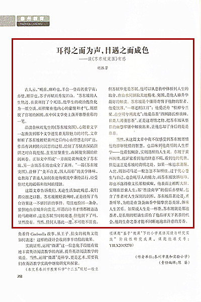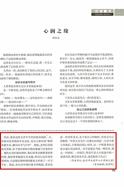 然而,我从这篇文章中学到的最深刻的一点,是苏轼对待外物的审美态度,他自己曾评道“粗缯大布裹生涯,腹有诗书气自华”。我想,之所以苏轼会成为苏轼,在于他对世间万物的虔诚与对美的崇拜。现代生活忙碌而琐碎,我们常常会被繁重的事物囚禁,我们常常抱怨生活无趣,然而生活并没有变得单调,只是我们用单调的眼光去审视了一片万紫千红。因此,在生活中我们要少些抱怨,多多品读一些佳作美文,先丰富自己的胸怀,再充实自己的眼眶。“耳得之而为声,目遇之而成色”,生活不曾亏待我们,只要我们用心对待,以一个探索者的态度去泡生活这杯茶,而不是把它当成一种任务,一切挫折、一切痛苦,终究只是人生旅途中的一道道风景,眼见的美不美,还是取决于自己!