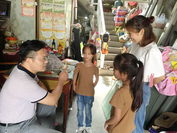 6月28日下午,我和教导处郑小兰主任,一年级班主任何燕老师一起走访了两个学生家庭。其中一个家庭来自江西,生了三个女孩,在我校上学的两个小女孩,是孪生姐妹,一个叫龙瑜、另一个叫龙玥,都在一(1)班,夫妇二人租了鹏欣尚城的店面房做门窗生意。另一个是兴化人,孩子跟妈妈生活,给人家打工,做广告生意。