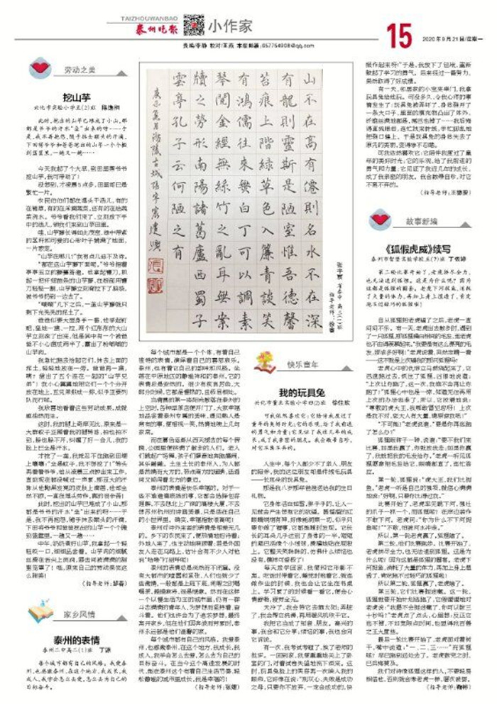 该该习作发表在《泰州晚报》小作家栏目,是丁依婷同学的一次课内练笔。全文条理清晰,文笔流畅,依托大家耳熟能详的故事《狐假虎威》,并结合自己的生活和阅读经验展开大胆想象,创编了三次比赛的故事情节,内容环环相扣,生动有趣。