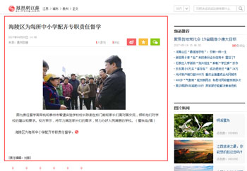 《凤凰网》海陵区为每所中小学配齐专职责任督学 来源:《凤凰网》 作者:翟秋临 发布时间:2017-06-05 浏览次数: 次 【字体:小 大】 图为责任督学周荣桃和泰州市智堡实验学校校长陈澍在校门前和家长们面对面交流,倾听他们对学校的建议和要求。校方表示,将尽力满足家长们的需求,努力办好人民满意的学校。(翟秋临/摄) 海陵区为每所中小学配齐专职责任督学。 本文发布于《凤凰网》http://js.ifeng.com/a/20170420/5595503_0.shtml 分享到: 【打印正文】