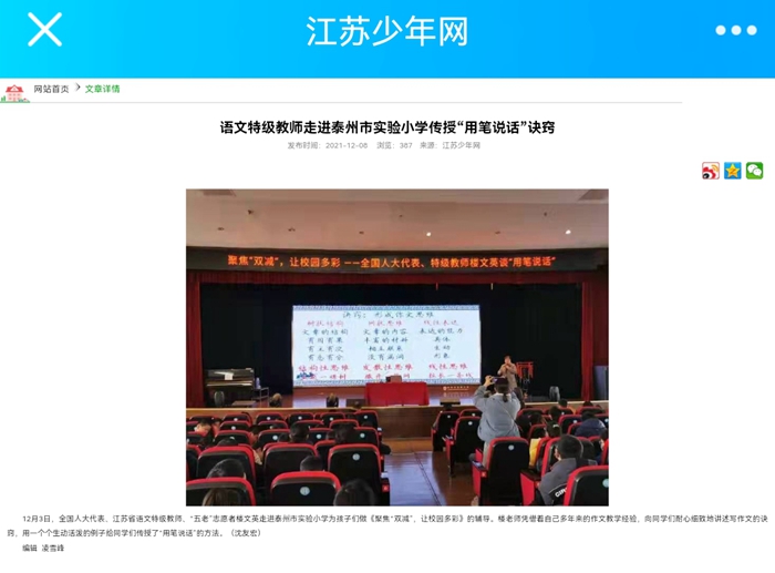 《江苏少年网》语文特级教师走进泰州市实验小学传授“用笔说话”诀窍