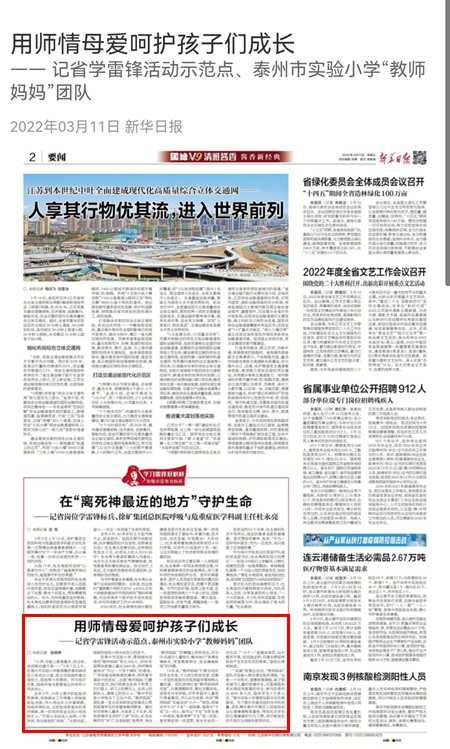 《新华日报》用师情母爱帮扶,“不让一个孩子掉队”——记江苏省学雷锋活动示范点、泰州市实验小学“教师妈妈”团队