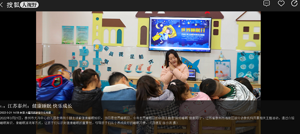 搜狐大视野|江苏泰州:健康睡眠 快乐成长 来源:搜狐大视野 作者:大疆鸿鹄旅游文化传媒 发布时间:2022-03-21 浏览次数: 次 【字体:小 大】 2022年3月21日,泰州市大冯中心幼儿园老师向小朋友讲解健康睡眠知识。 当日是世界睡眠日,今年世界睡眠日的中国主题是“良好睡眠 健康同行”。江苏省泰州市海陵区部分幼教机构开展相关主题活动,通过介绍睡眠常识、做睡眠游戏等方式,让孩子们认识到健康睡眠的重要性,引导孩子们从小养成良好的睡眠习惯。(汤德宏 徐小洪 摄)此新闻刊登于《搜狐大视野》2022年3月21日。 分享到: 【打印正文】 相关内容