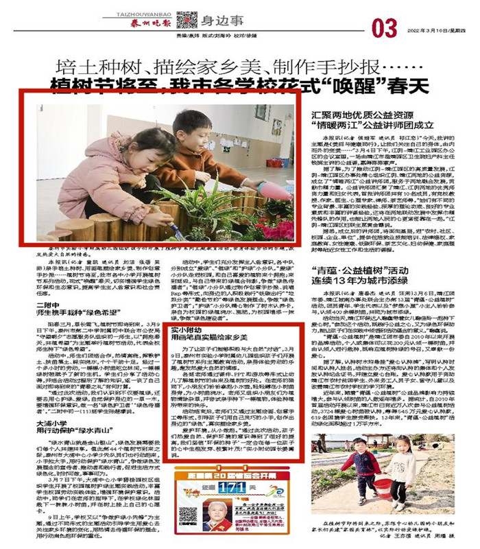 《泰州晚报》培土种树、描绘家乡美、制作手抄报…… 植树节将至,我市各学校花式“唤醒”春天