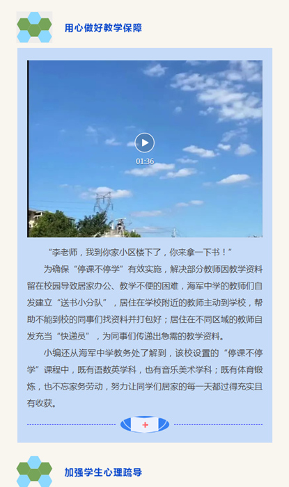 小编还从海军中学教务处了解到,该校设置的“停课不停学”课程中,既有语数英学科,也有音乐美术学科;既有体育锻炼,也不忘家务劳动,努力让同学们居家的每一天都过得充实且有收获。