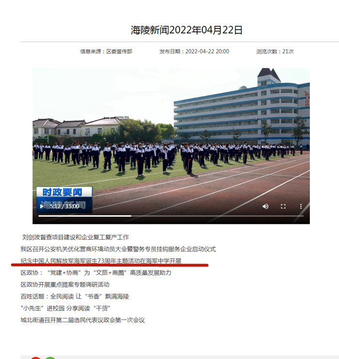 《海陵新闻》丨纪念中国人民解放军海军诞生73周年主题活动在海军中学开展 来源:海陵新闻 作者:未知 发布时间:2022-04-26 浏览次数: 次 【字体:小 大】 此视频转自2022年4月22日《海陵新闻》http://www.tzhl.gov.cn/art/2022/4/22/art_50812_3335689.html 分享到: 【打印正文】 相关内容