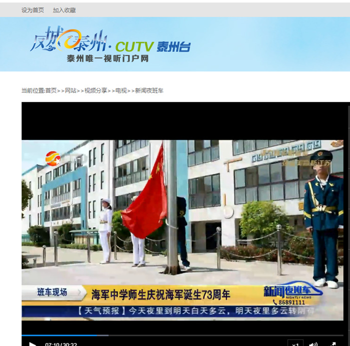 《新闻夜班车》丨海军中学师生庆祝海军诞生73周年 来源:泰州新闻综合频道 作者:张超 罗茂诚 发布时间:2022-04-26 浏览次数: 次 【字体:小 大】 此视频转自2022年4月23日《新闻夜班车》http://www.mytaizhou.net/folder114/folder45/folder57/folder62/2022-04-23/563741.html 分享到: 【打印正文】 相关内容