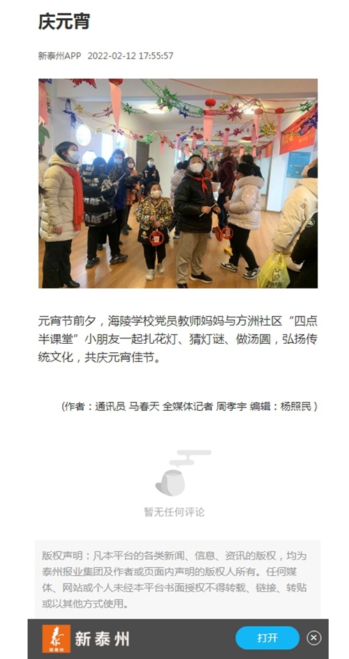 《新泰州》庆元宵 来源:《新泰州》 作者:马春天 周孝宇 杨照民 发布时间:2022-05-26 浏览次数: 次 【字体:小 大】 《新泰州》庆元宵 新泰州APP 2022-02-12 17:55:57 元宵节前夕,海陵学校党员教师妈妈与方洲社区“四点半课堂”小朋友一起扎花灯、猜灯谜、做汤圆,弘扬传统文化,共庆元宵佳节。 (作者:通讯员 马春天 全媒体记者 周孝宇 编辑:杨照民) https://h5.newaircloud.com/detailArticle/18307692_76944_taizhourb.html?source=1 分享到: 【打印正文】 相关内容