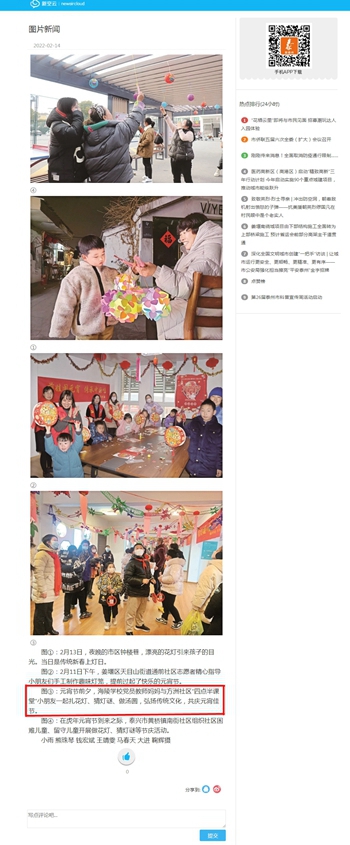 《新泰州》图片新闻 来源:《新泰州》 作者:小雨 熊珠琴 钱宏斌 王靖雯 马春天 大进 鞠辉 发布时间:2022-05-26 浏览次数: 次 【字体:小 大】 《新泰州》图片新闻 2022-02-14 图③:元宵节前夕,海陵学校党员教师妈妈与方洲社区“四点半课堂”小朋友一起扎花灯、猜灯谜、做汤圆,弘扬传统文化,共庆元宵佳节。 小雨 熊珠琴 钱宏斌 王靖雯 马春天 大进 鞠辉摄 https://h5.newaircloud.com/newsepaper/detail/10294_109196_1384094_18528266_taizhourb.html 分享到: 【打印正文】 相关内容