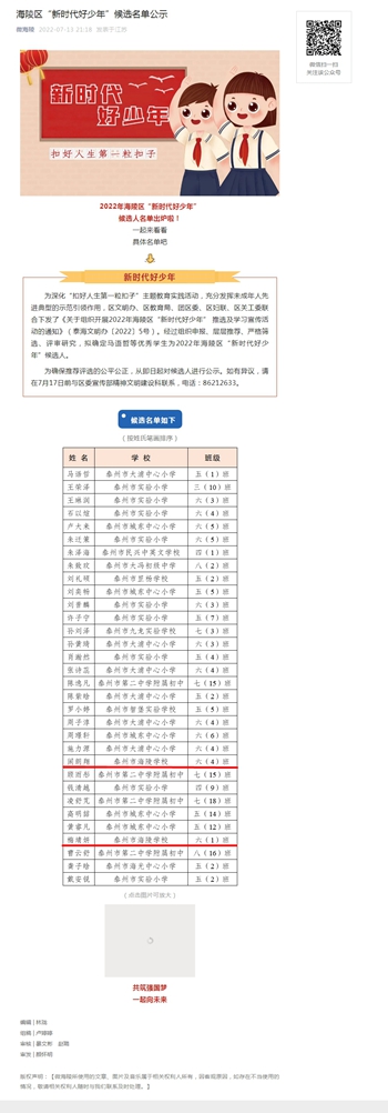 为深化“扣好人生第一粒扣子”主题教育实践活动,充分发挥未成年人先进典型的示范引领作用,区文明办、区教育局、团区委、区妇联、区关工委联合下发了《关于组织开展2022年海陵区“新时代好少年” 推选及学习宣传活动的通知》(泰海文明办〔2022〕5号)。经过组织申报、层层推荐、严格筛选、评审研究,拟确定马语哲等优秀学生为2022年海陵区“新时代好少年”候选人。