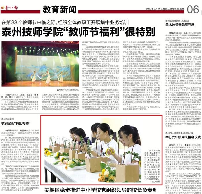 《泰州日报》里华小学:德润馨香 “师”情花艺 来源:《泰州日报》 作者:金小强 发布时间:2022-09-14 浏览次数: 次 【字体:小 大】 “向日葵向阳而生,象征着老师用爱心温暖每一个学生……”近日,泰州市里华中心小学举办了教师艺术插花活动。全体教师欢聚一堂,取材、剪叶、搭配、插花,在轻松愉快的氛围中共同感受着节日的温馨和美好。 此文登于2022年9月14日《泰州日报》教育新闻。 分享到: 【打印正文】