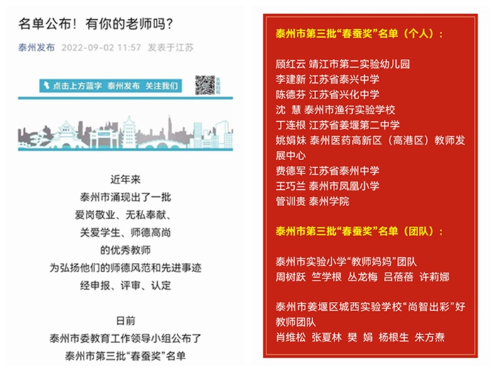 近年来,泰州市涌现出了一批爱岗敬业、无私奉献、关爱学生、师德高尚的优秀教师。为弘扬他们的师德风范和先进事迹,经申报、评审、认定,日前,泰州市委教育工作领导小组公布了泰州市第三批“春蚕奖”名单,9名个人和2个团队获授泰州市第三批“春蚕奖”。