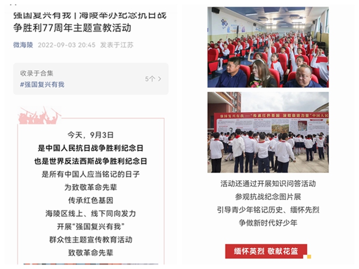 今天,9月3日,是中国人民抗日战争胜利纪念日,也是世界反法西斯战争胜利纪念日,是所有中国人应当铭记的日子。为致敬革命先辈、传承红色基因,海陵区线上、线下同向发力,开展“强国复兴有我”群众性主题宣传教育活动,致敬革命先辈。
