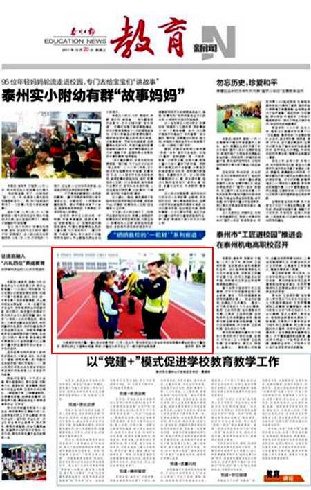 《泰州日报》实验小学举行“暖冬浓情,安全出行”感恩活动 来源:泰州日报 作者:高娟 凌玲 发布时间:2017-12-22 浏览次数: 次 【字体:小 大】 为感谢护学岗交警一直以来的辛勤守护,12月4日上午,泰州市实验小学全体学生利用集体晨会时间为交警叔叔、阿姨们送上了温暖的祝福,同时,交警也为孩子们上了一堂交通安全教育课。通讯员 凌玲 摄 此图片新闻刊登于2017年12月20日《泰州日报》。 分享到: 【打印正文】 相关内容