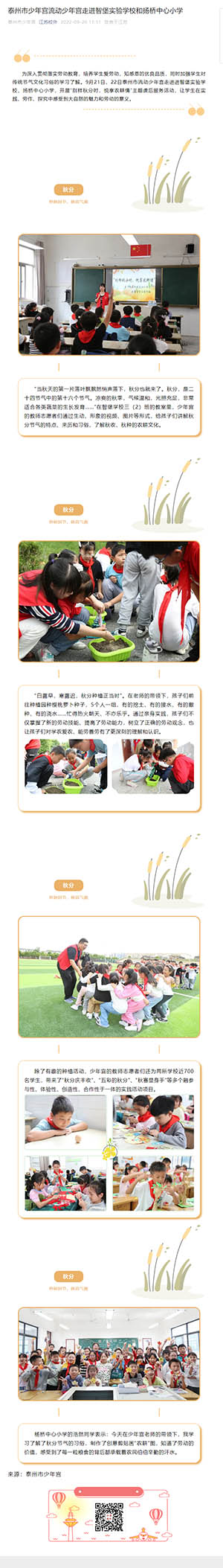 为深入贯彻落实劳动教育,培养学生爱劳动,知感恩的优良品质,同时加强学生对传统节气文化习俗的学习了解。9月21日、22日泰州市流动少年宫走进进智堡实验学校、扬桥中心小学,开展“别样秋分时,悦享农耕情”主题课后服务活动,让学生在实践、劳作、探究中感受到大自然的魅力和劳动的意义。
