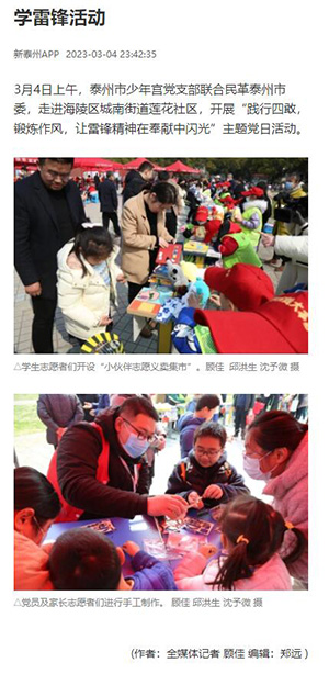 《新泰州》APP 学雷锋活动 来源:少年宫 作者:邱洪生 发布时间:2023-04-08 浏览次数: 次 【字体:小 大】 3月4日上午,泰州市少年宫党支部联合民革泰州市委,走进海陵区城南街道莲花社区,开展“践行四敢,锻炼作风,让雷锋精神在奉献中闪光”主题党日活动。 此文刊登于2023年3月4日《新泰州》APPhttps://h5.newaircloud.com/detailArticle/21235565_66096_taizhourb.html?app=1&source=1 分享到: 【打印正文】 相关内容
