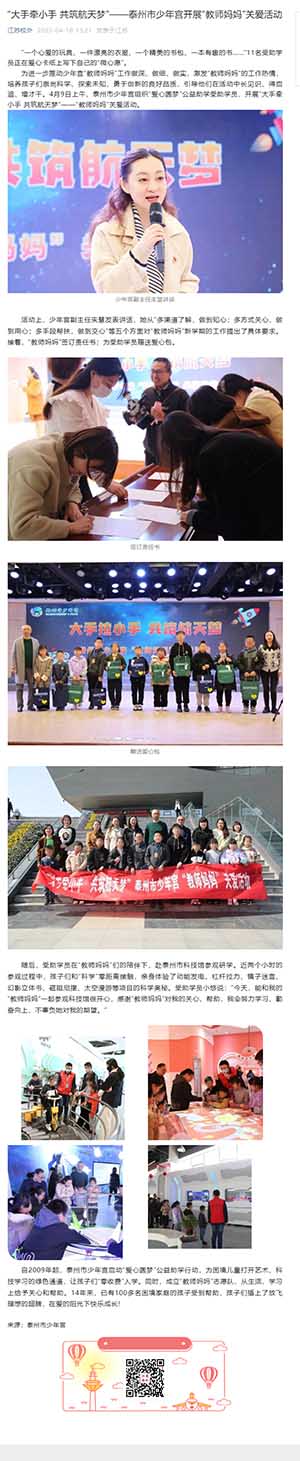 《江苏校外》“大手牵小手 共筑航天梦”——泰州市少年宫开展“教师妈妈”关爱活动