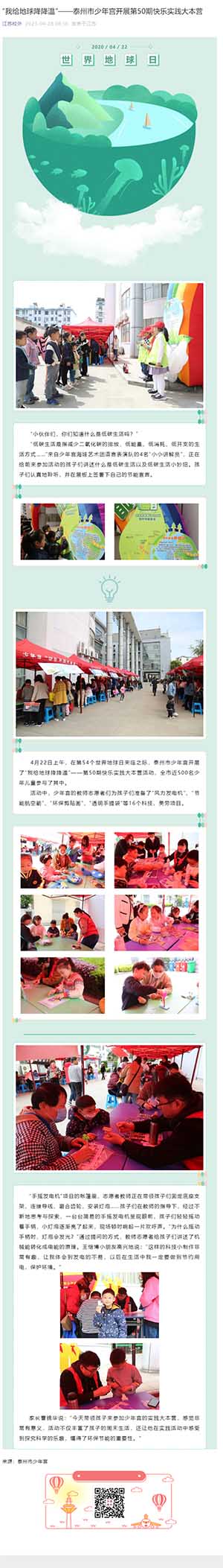 4月22日上午,在第54个世界地球日来临之际,泰州市少年宫开展了“我给地球降降温”——第50期快乐实践大本营活动,全市近500名少年儿童参与了其中。