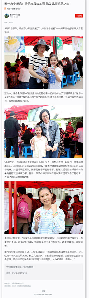泰州市少年宫党支部书记、主任张忠表示:“我们举办感恩母亲节主题活动,旨在弘扬中华民族传统美德,树立文明家风,积极营造感恩母爱、关爱母亲的良好社会氛围,培养孩子们学会用行动表达对母亲的爱,从小知感恩、有善心。”