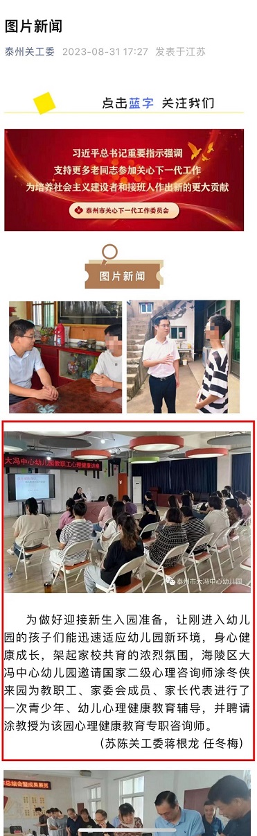泰州工关委|图片新闻 来源: 作者:大冯幼儿园 发布时间:2023-09-08 浏览次数: 次 【字体:小 大】 为做好迎接新生入园准备,让刚进入幼儿园的孩子们能迅速适应幼儿园新环境,身心健康成长,架起家校共育的浓烈氛围,海陵区大冯中心幼儿园邀请国家二级心理咨询师涂冬侠来园为教职工、家委会成员、家长代表进行了一次青少年、幼儿心理健康教育辅导,并聘请涂教授为该园心理健康教育专职咨询师。(此新闻刊登于《泰州工关委》2023年8月31日) 分享到: 【打印正文】 相关内容