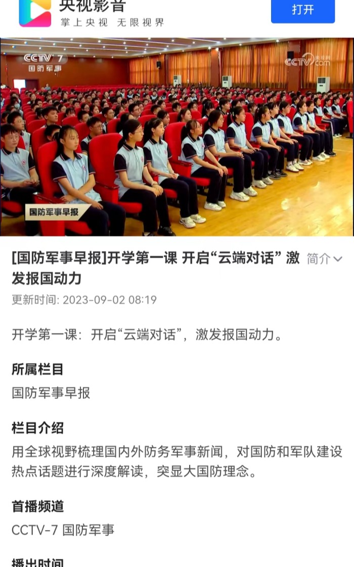 央视军事新闻丨《国防军事早报》开学第一课 开启“云端对话” 激发报国动力 来源:泰州市海军中学 作者: 发布时间:2023-09-14 浏览次数: 次 【字体:小 大】 此图转自2023年9月2日央视七套《国防军事早报》https://app.cctv.com/special/m/livevod/index.html?vtype=2&guid=84166ea5763a46aaaf14a49bcbf62915&vsetId=VSET100431636555 分享到: 【打印正文】 相关内容