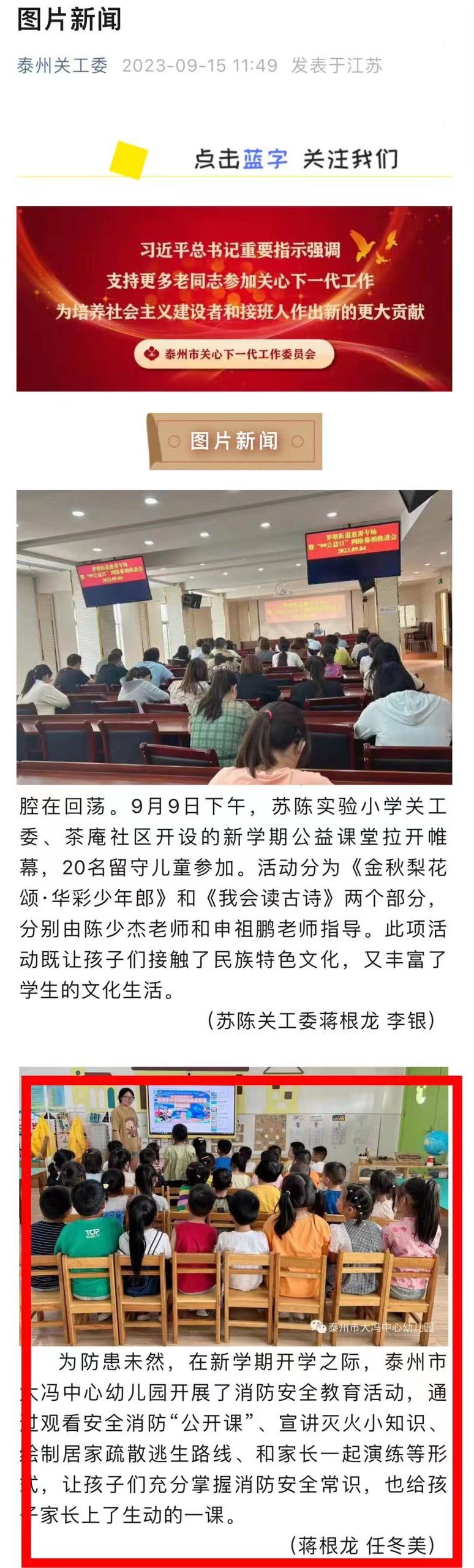 泰州关工委|图片新闻 来源: 作者: 发布时间:2023-09-15 浏览次数: 次 【字体:小 大】 为防患未然,在新学期开学之际,泰州市大冯中心幼儿园开展了消防安全教育活动,通过观看安全消防“公开课”、宣讲灭火小知识、绘制居家疏散逃生路线、和家长一起演练等形式,让孩子们充分掌握消防安全常识,也给孩子家长上了生动的一课。(此新闻刊登于《泰州关工委》2023年9月15日) 分享到: 【打印正文】 相关内容