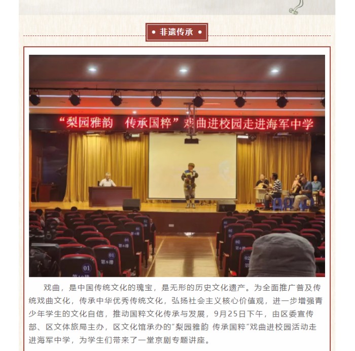 戏曲,是中国传统文化的瑰宝,是无形的历史文化遗产。为全面推广普及传统戏曲文化,传承中华优秀传统文化,弘扬社会主义核心价值观,进一步增强青少年学生的文化自信,推动国粹文化传承与发展,9月25日下午,由区委宣传部、区文体旅局主办,区文化馆承办的“梨园雅韵 传承国粹”戏曲进校园活动走进海军中学,为学生们带来了一堂京剧专题讲座。