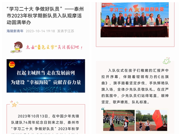 《海陵新青年》“学习二十大 争做好队员”——泰州市2023年秋学期新队员入队观摩活动圆满举办