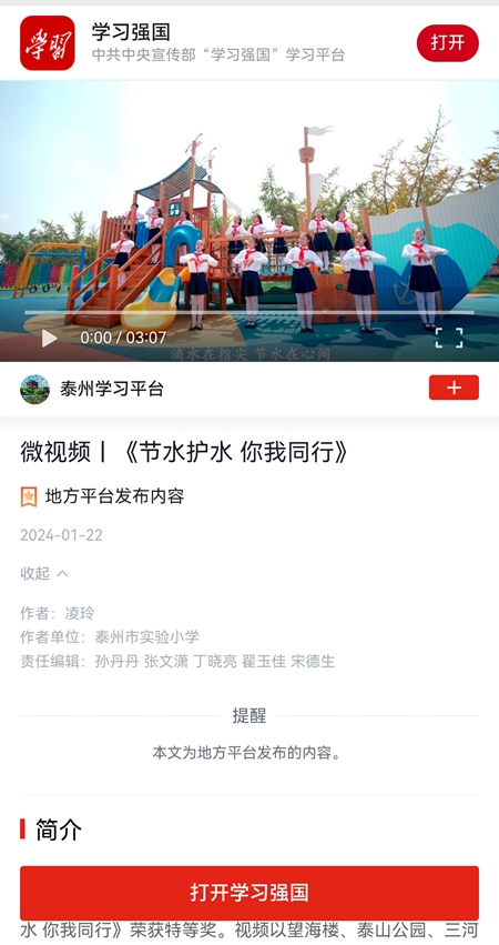 近日,第三届“水韵江苏——节水少年行”活动评选结果揭晓,江苏省泰州市实验小学制作拍摄的节水短视频《节水护水你我同行》荣获特等奖。视频以望海楼、泰山公园、三河湾公园为背景,配以动人的歌声和优美的舞蹈,生动记录了学校开展的节水实践行动,号召大家从自身做起,树立节水观念,以实际行动节约保护水资源,助力城市绿色发展。