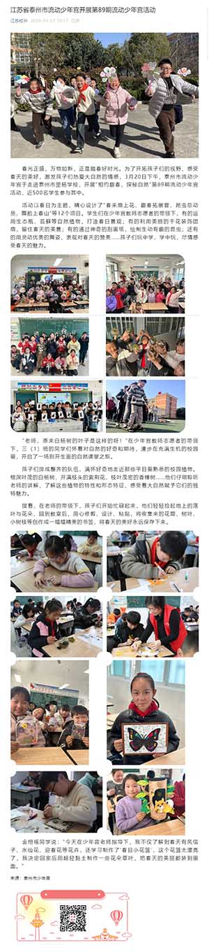 春光正盛,万物如新,正是踏春好时光。为了开拓孩子们的视野、感受春天的美好,激发孩子们热爱大自然的情感,3月20日下午,泰州市流动少年宫于走进泰州市罡杨学校,开展“相约趣春,探秘自然”第89期流动少年宫活动,近500名学生参与其中。