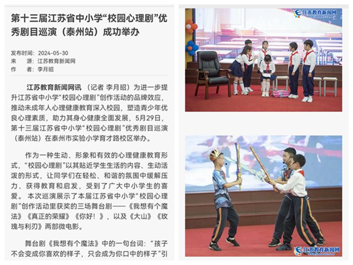 2024年5月30日《江苏教育新闻网》第十三届江苏省中小学“校园心理剧”优秀剧目巡演(泰州站)成功举办