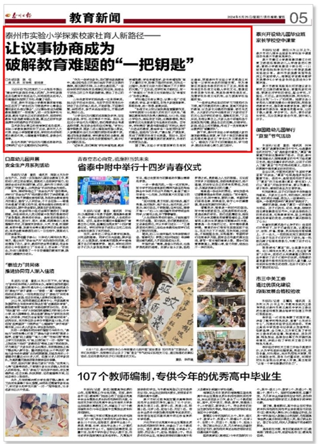 《泰州日报》泰州市实验小学探索校家社育人新路径——让议事协商成为破解教育难题的“一把钥匙”