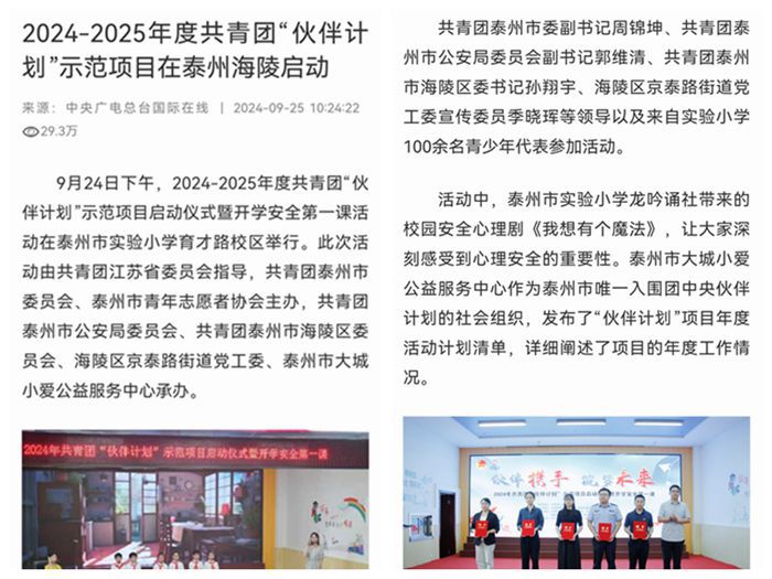 2024.9.25《国际在线》2024-2025年度共青团“伙伴计划”示范项目在泰州海陵启动