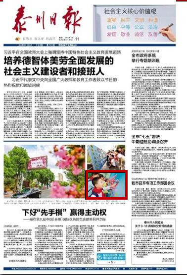 《泰州日报》图片新闻:献给老师的特殊礼物 来源: 作者:孙勇 发布时间:2018-09-15 浏览次数: 次 【字体:小 大】 昨天是第34个教师节。图①:靖江街头,LED电子屏为教师“亮灯”。图②:泰州市大浦中心小学开展“我最喜爱的老师”绘画展和征文活动。图③:泰州市城东中心小学鼓楼校区开展“献给老师的特殊礼物”活动,并在校门口摆放了一个大展板,鼓励孩子将祝福语以小卡片的形式展现出来。 盛义 顾俊 小雨 张蓓 童凯 孙勇 顾梅摄 此图片新闻刊登于《泰州日报》2018年9月11日A01版 分享到: 【打印正文】 相关内容