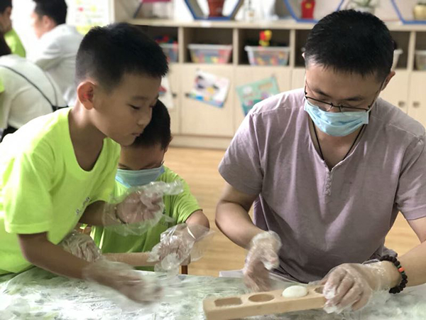 上午9点多,孩子们便开始和家长一起和面、做月饼、贴标签,忙得不亦乐乎。大班的龙龙和父母很快便做好了一个月饼,他得意地说,原来月饼做起来这么简单,就是先将面团压成圆圆的小饼,再将香甜的馅儿包进去,最后通过模具压出不同的花纹和图案,一个小小的月饼就做好了。