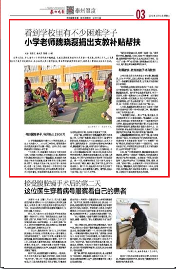 《泰州晚报》看到学校里有不少困难学子 小学老师魏晓磊捐出支教补贴帮扶