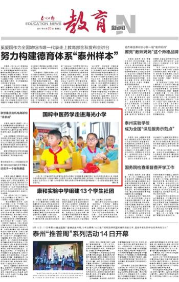 《泰州日报》国粹中医药学走进海光小学 来源:泰州日报 作者:景秀 发布时间:2017-10-27 浏览次数: 次 【字体:小 大】 9月6日,江苏省中医药学会护理专业委员会开展的“悠悠百草情、岐黄校园行”活动走进泰州市海光小学,来自泰州市中医院的医护人员向学校赠送了中医药文化读本,并面向师生开展了中药食材、穴位等中医药知识科普讲座和体验活动,让孩子们从小了解、认识中医药学,同时让老师们切身感受到中医护理的魅力。图为学生在医生指导下熟悉手部穴位。 此图片新闻刊登于《泰州日报》2017年9月20日教育版面首版 分享到: 【打印正文】 相关内容