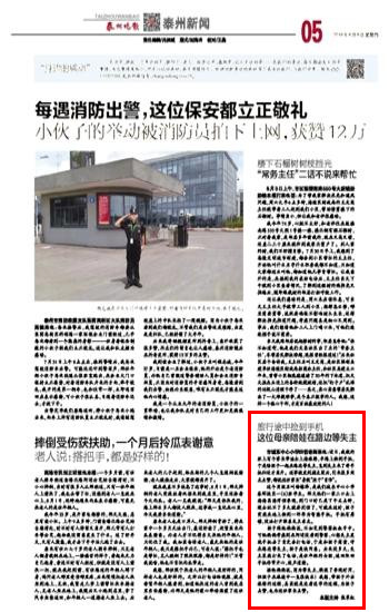 《泰州晚报》旅行途中捡到手机 这位母亲陪娃在路边等失主