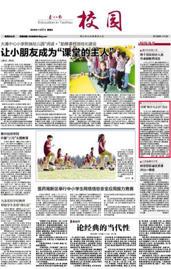 此文刊登于2019年11月8日《泰州日报 校园版》