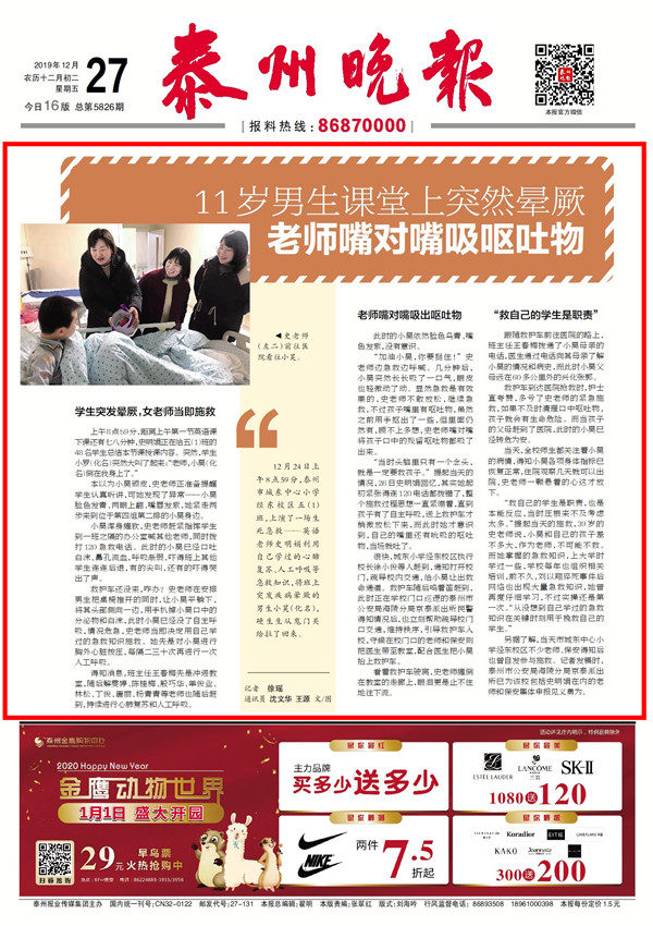 《泰州晚报》11岁男生课堂上突然晕厥,老师嘴对嘴吸呕吐物