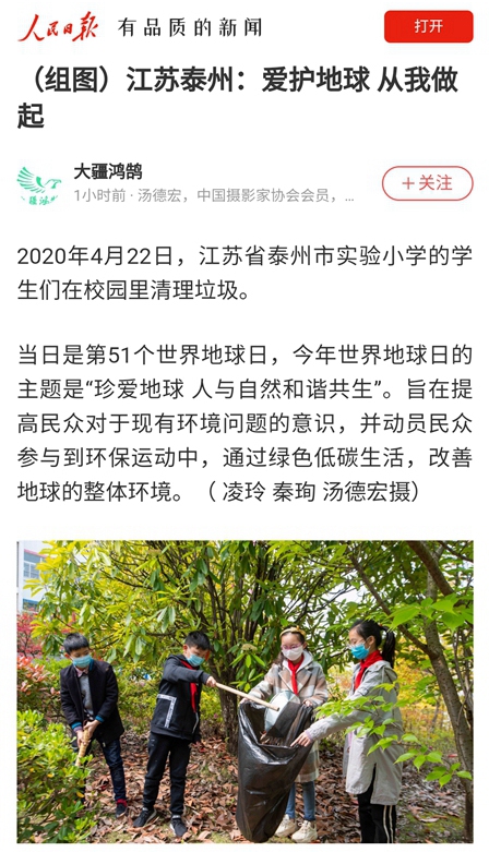 《人民日报》网江苏泰州:爱护地球 从我做起 来源:人民日报网 作者:凌玲 秦珣 汤德宏 发布时间:2020-04-22 浏览次数: 次 【字体:小 大】 2020年4月22日,江苏省泰州市实验小学的学生们在校园里清理垃圾。 当日是第51个世界地球日,今年世界地球日的主题是“珍爱地球 人与自然和谐共生”。旨在提高民众对于现有环境问题的意识,并动员民众参与到环保运动中,通过绿色低碳生活,改善地球的整体环境。( 凌玲 秦珣 汤德宏摄) 分享到: 【打印正文】 相关内容